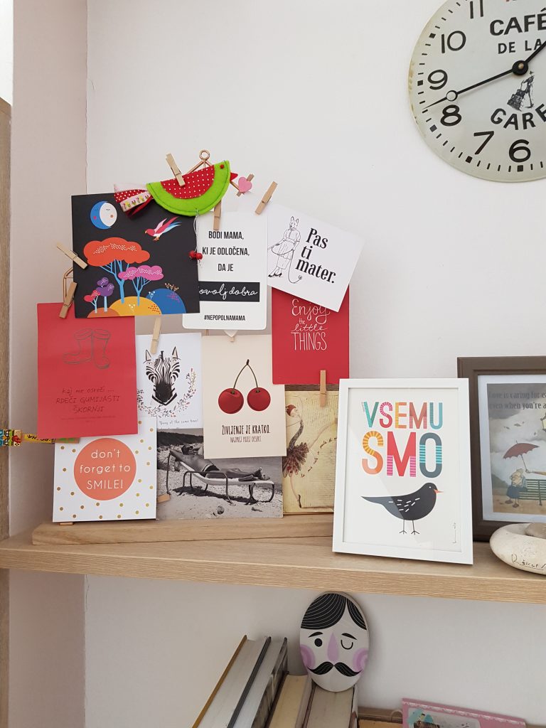 V študentskih letih sem na potovanjih zelo rada kupovala spominske kartice, ki sem jih shranjevala za spomin na kraje, ki sem jih obiskovala. Nekatere so resnično lepe in škoda bi bilo, da bi ostale skrite v škatli v omari. Zato sem pred kratkim kupila držalo za kartice, kjer sem jih obesila in postavila na polico v dnevni sobi. Dodala sem še nekaj motivacijskih kartic, ki so v zadnjih letih tudi zelo popularne. Držal za kartice, fotografije, itd. je v trgovinah z notranjo opremo res veliko na izbiro, lahko pa kartice z lesenimi kljukicami obesite tudi na vrvico, ki jo pripnete ma željeno mesto v domu.