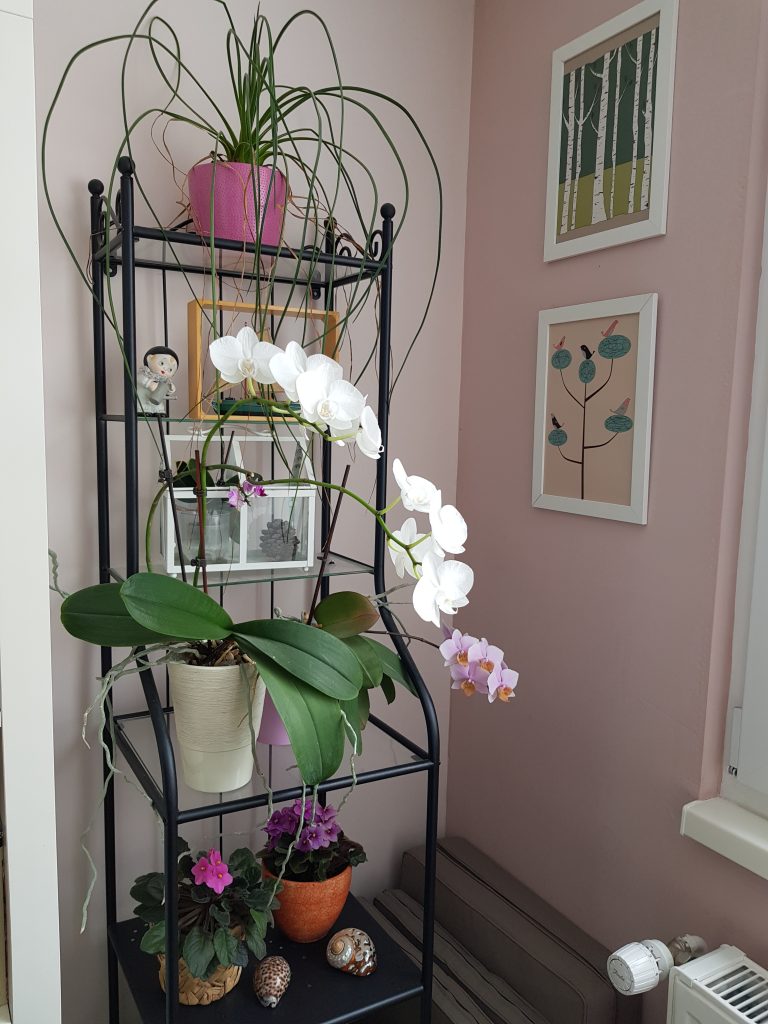 Ker živimo v vrstni hiški, imamo posledično okna le na prednji in zadnji steni, zato nam na mojo žalost primanjkuje svetlega prostora za notranje rastline. Zelo rada imam zelenje v prostoru, zato imam tik ob oknu poličko, ki je namenjena rožam. Če bi imela dovolj prostora ali okna do tal, bi zagotovo imela v hiši na tleh postavljeno tudi kakšno večjo lončnico.