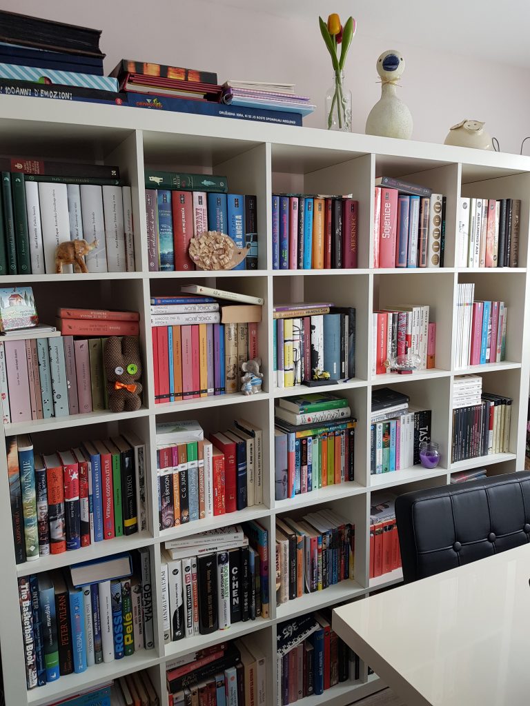 Za založene knjižne police v naši hiši skrbi Jure in kmalu bomo imeli doma že čisto pravo knjižnico J Knjige so danes opremljene z lepimi in pisanimi naslovnicami, zato na policah delujejo živahno in popestrijo knjižno omaro.