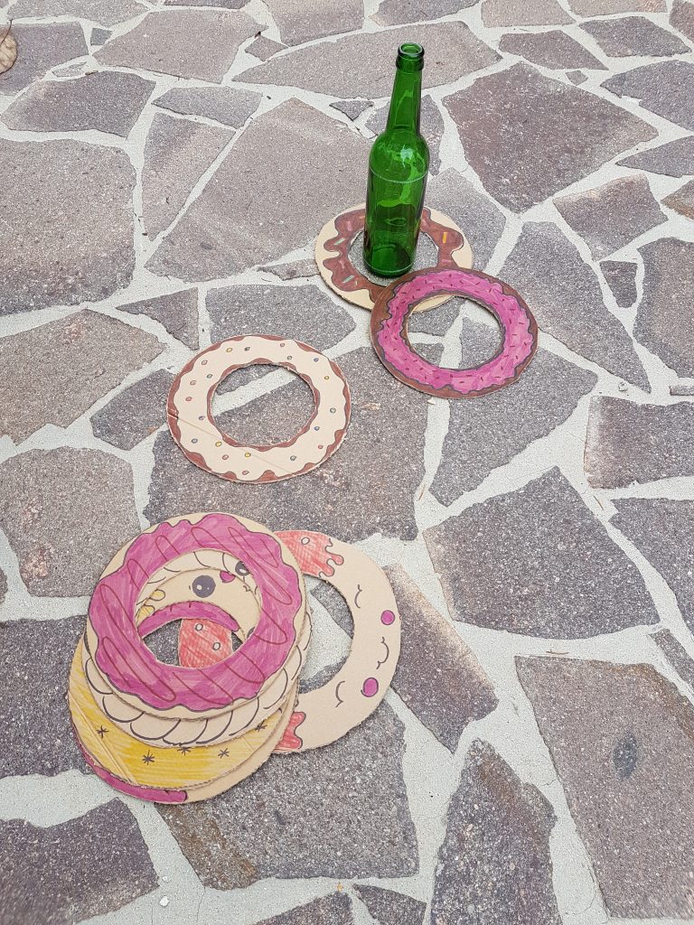 Ker mi je od ribje tarče ostalo nekaj okroglih kosov kartona, sem jih porabila za izdelavo obročev, ki jih lahko otroci nato mečejo na palico ali steklenico. V sredino krogov sem izrezala manjši krog, nastale obroče pa sem pobarvala z motivi ameriških krofov. Seveda se jih lahko okrasi z motivi po lastni želji. Možnosti je ogromno.