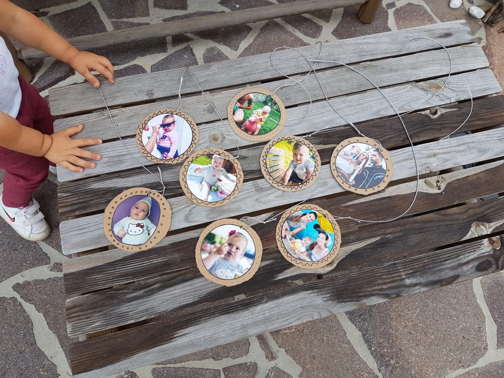 Od krofastih obročev mi je na koncu ostalo še nekaj manjših okroglih kosov kartona. Razmišljala sem kako bi jih uporabila in na koncu iz njih izdelala Višnjin časovni trak. Na kartončke sem nalepila Višnjine fotografije iz preteklega leta in na vrhu zavezala trak, tako da se kartončki lahko obesijo na drevo in tako popestrijo rojstnodnevno zabavo.