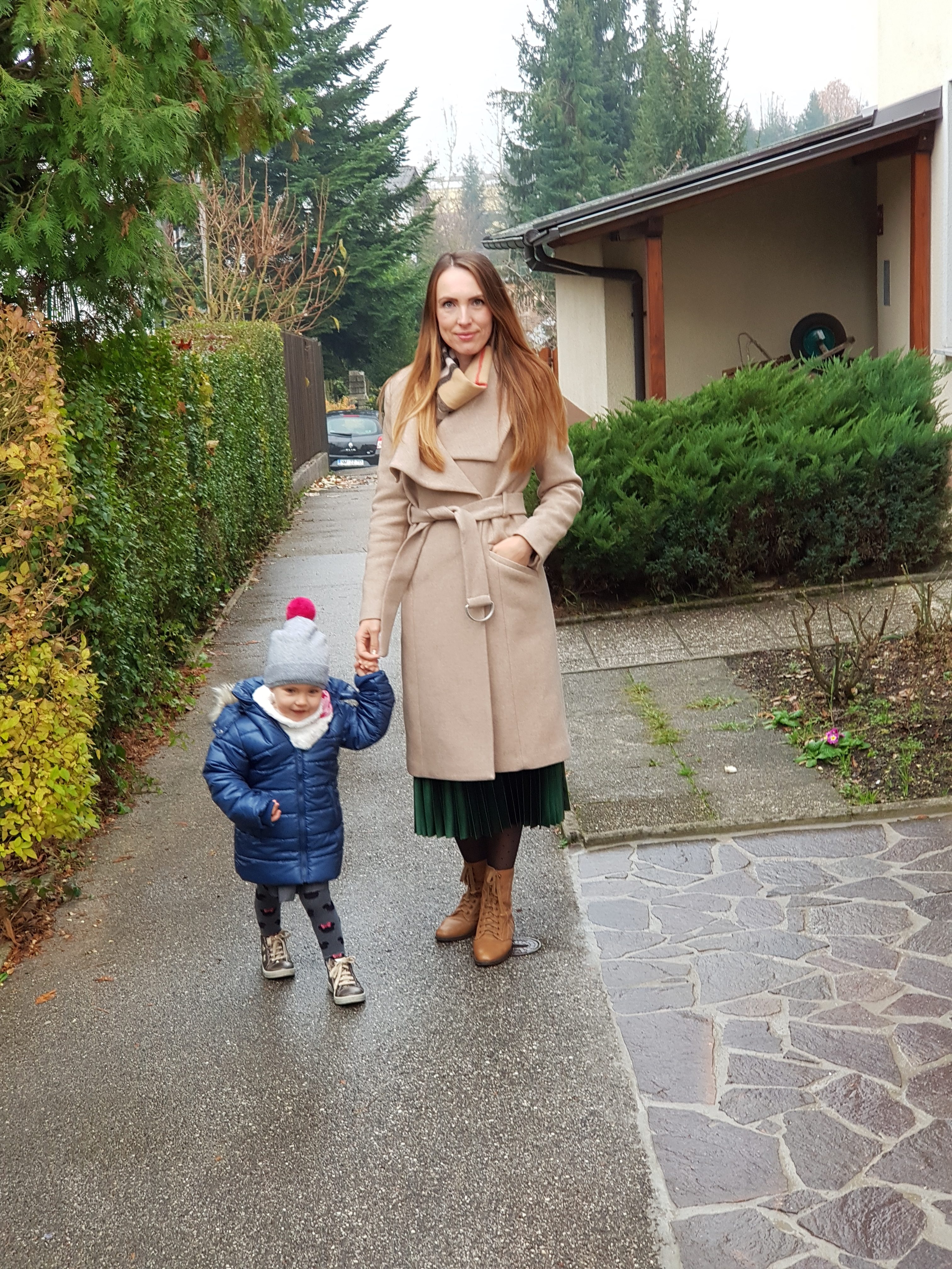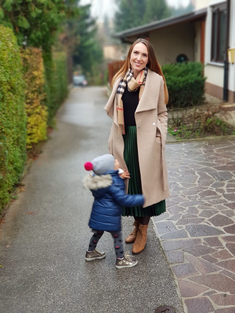 Medtem ko sem bila doma na porodniški, sem nosila predvsem udobna športna oblačila in bunde, letos pa sem si ob vrnitvi na delovno mesto privoščila tudi nov plašč. Iskala sem ga kar nekaj časa in si nato izbrala klasičen kroj v peščeni barvi v trgovini Mango. Z njim sem res zadovoljna, saj se lepo kombinira tako na elegantne, kot tudi bolj športne oprave. Na spodnjih fotografijah sem ga kombinirala z zelenim plisiranim krilom ter čevlji in dodatki v rjavih tonih.